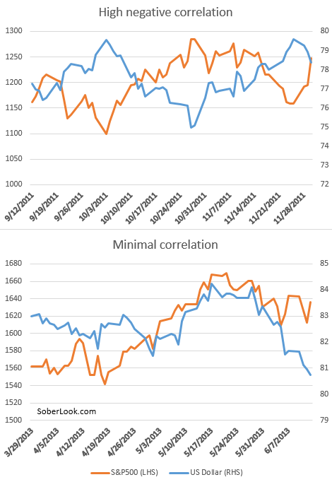 As a follow-up to the discussion on “risk-on/risk-off” (see post), there is further evidence that the market dynamics that have been in place over the past four years have recently been altered. The negative correlation between the US dollar and the US equity markets is nearly gone.